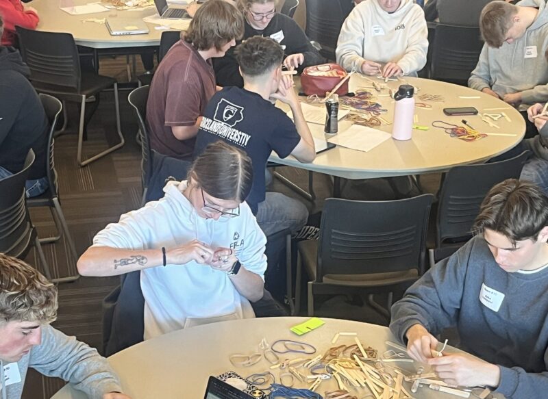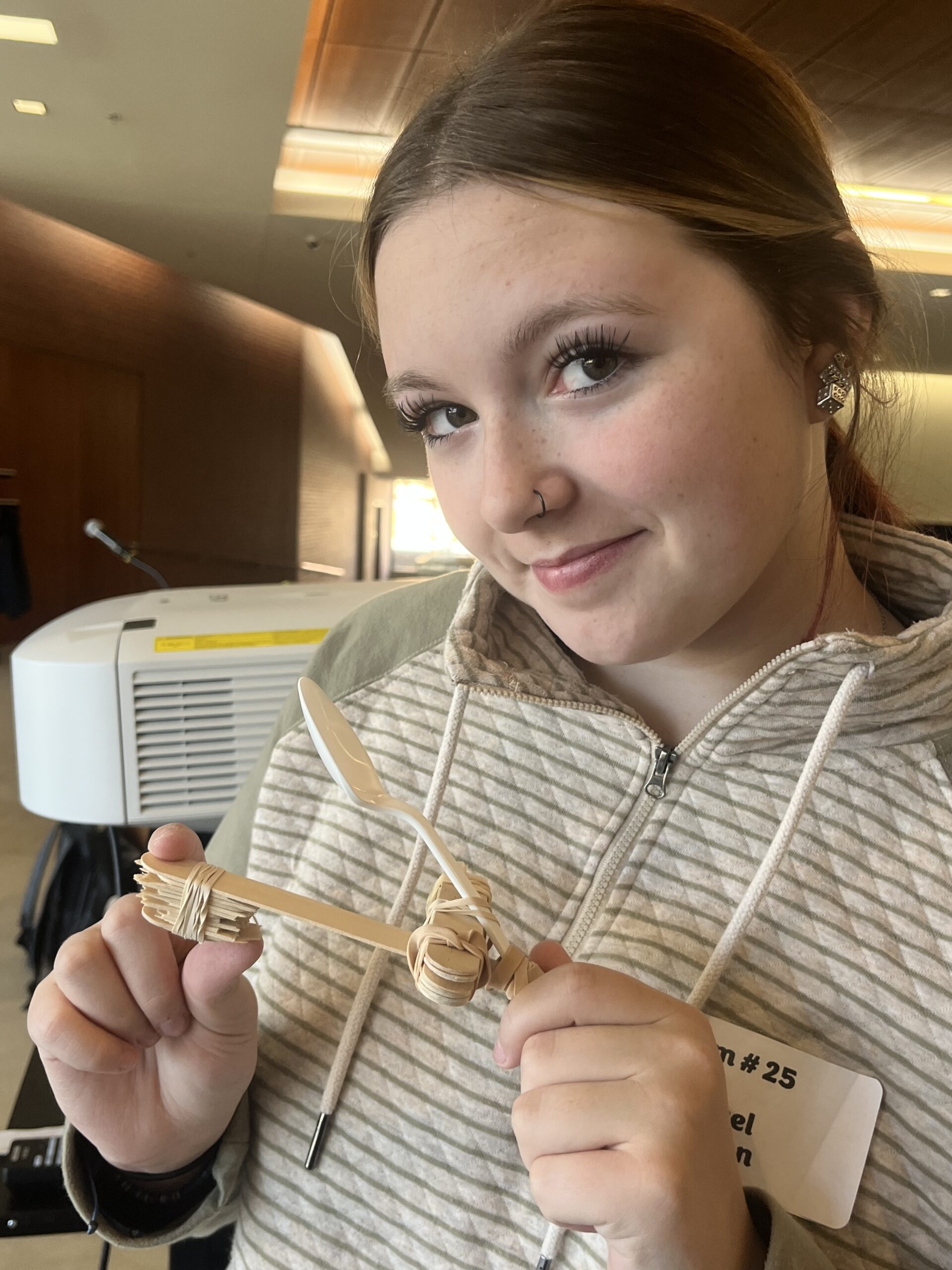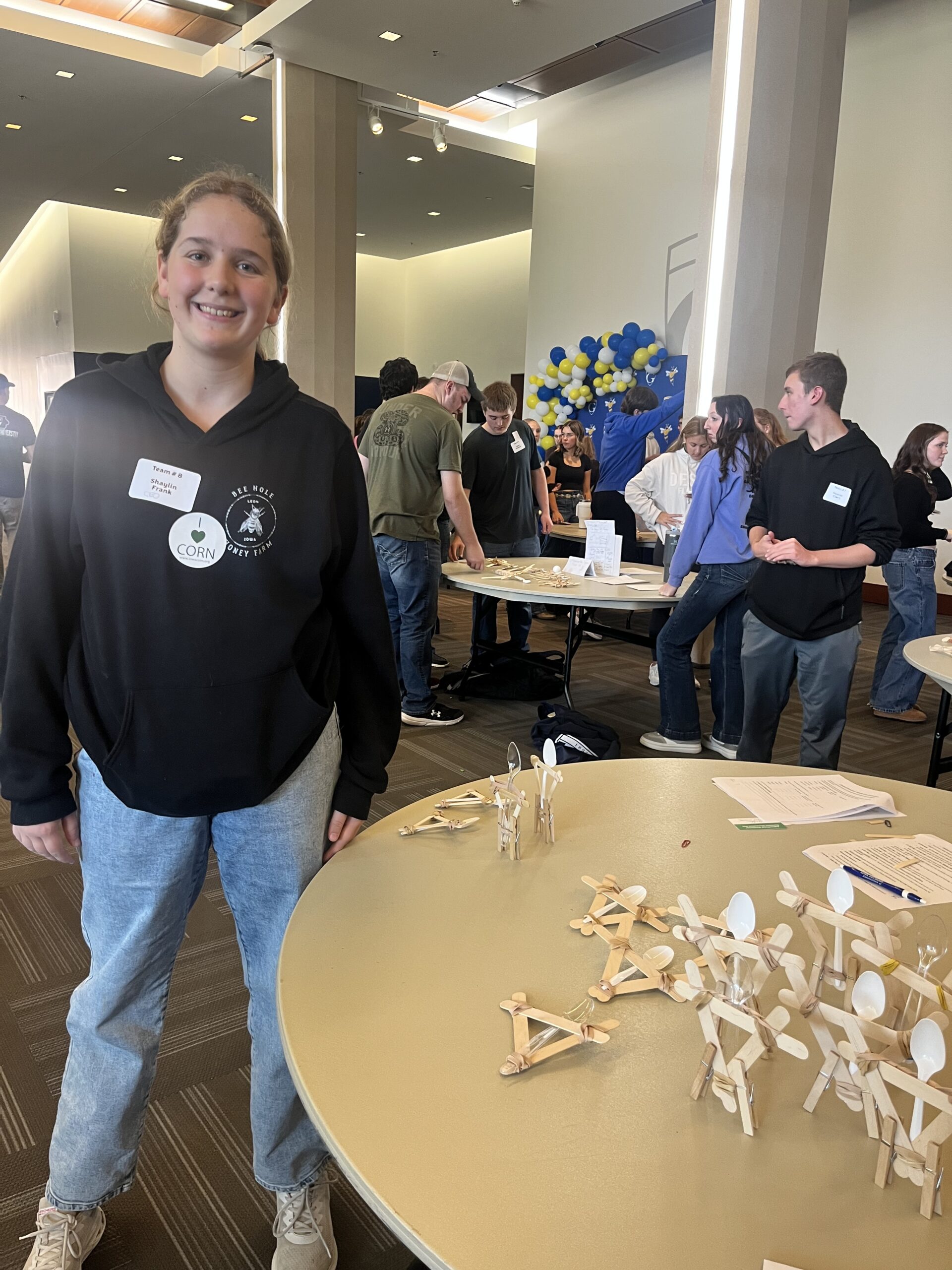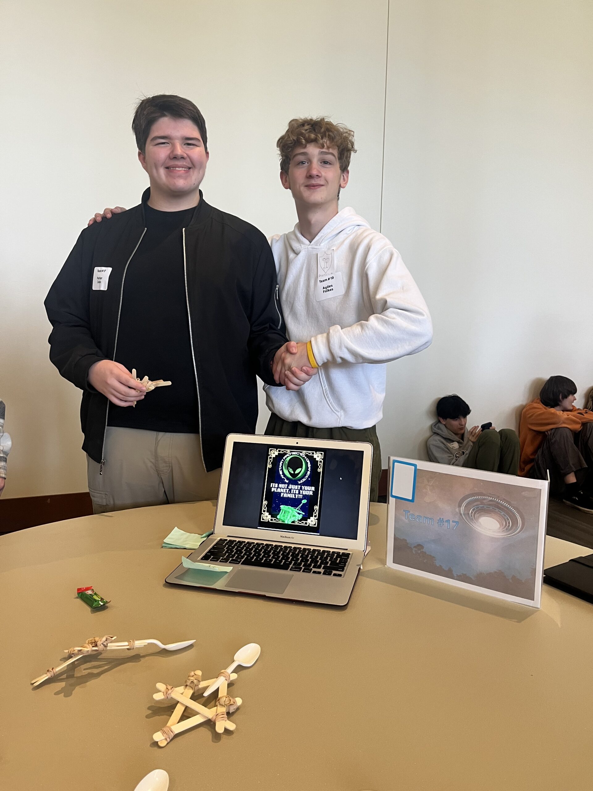 Students were mixed into teams of four with peers from other schools and given a creative challenge: design an “Alien Invasion Defense Mechanism”. Each team was allotted $100 in fake money to purchase materials such as rubber bands, plastic spoons, clothespins, and popsicle sticks. After budgeting carefully, teams constructed a prototype, developed a marketing plan, created financial statements, and delivered a Shark Tank–style pitch in a boardroom setting to business faculty and college student judges.