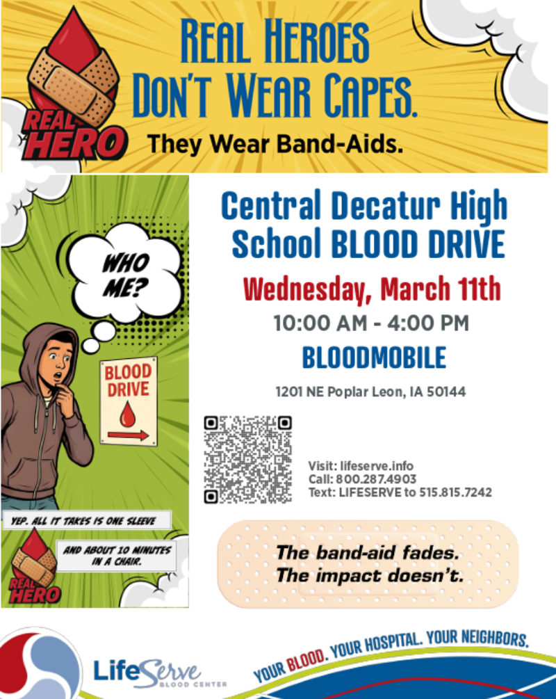 The next Life Serve Blood Drive at Central Decatur will be on Wednesday, March 11, from 10:00 am to 4:00 pm in the front circle of the HS drive. Please scan the code to register or contact tricia.applegate@centraldecatur.org.